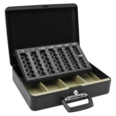 Uzamykateľná pokladňička vyrobená z kvalitnej ocele, so sklopným mechanizmom na mince. vnútro obsahuje vyberateľný plastový euro mincovník /1 cent až 2 € 4 plastové priehradky na bankovky 2x pohodlné plastové madlo na ľahké prenášanie 2 kľúče hmotnosť: 2,93 kg farba: čierna matná