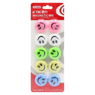 Magnetky "veselí smajlíci" vhodné na označenie skriniek v šatniach škôlky /školy, pripnutie papierových poznámok na chladničku, magnetickú tabuľu a pod. rozmer magnetky: 20 x 5 mm (priemer x hrúbka) PVC materiál s magnetickým pásikom silná priľnavosť balenie obsahuje 10 ks magnetiek päť jasných pastelových farieb
