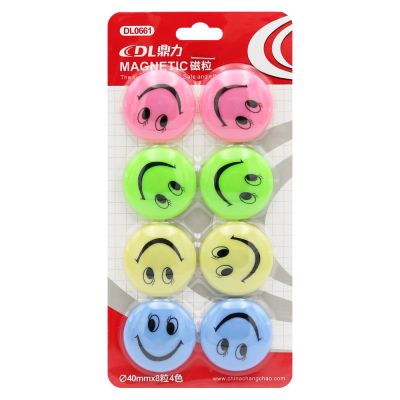 Magnetky "veselí smajlíci" vhodné na označenie skriniek v šatniach škôlky /školy, pripnutie papierových poznámok na chladničku, magnetickú tabuľu a pod. rozmer magnetky: 40 x 8 mm (priemer x hrúbka) PVC materiál s magnetickým pásikom silná priľnavosť balenie obsahuje 8 ks magnetiek štyri jasné pastelové farby