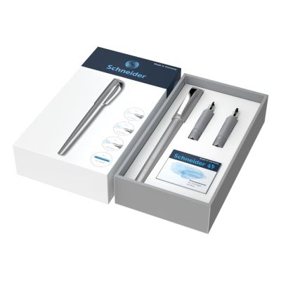 Plniace pero na bombičku s kaligrafickým hrotom Schneider Callissima v darčekovej krabičke. plniace pero s kaligrafickým hrotom 1x 1,1mm, 1x 1,5 mm, 1x 1,8 mm elegantná metalická farba pera s odolným kovovým klipom pre naplnenie pera sú vhodné klasické bombičky alebo možno použiť konvertor použitá náplň: bombička Pero obsahuje 1 ks prázdnu bombičku a 1 ks plnú bombičku. Pred inštaláciou bombičky je nutné prázdnu bombičku vložiť do tela pera ako prítlak pre bombičku s atramentom!V prípade, ak jedna bombička nepritláča na druhú, pero nepíše.Po inštalácii bombičky doporučujeme perom potriasť a podržať v zvislej polohe maximálne do jednej minúty pre úplné natečenie atramentu do hrotu pera!