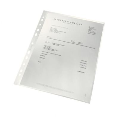 -vrecká na dokumenty vyrobené z mäkkej, ekologickej polypropylénovej fólie 40µm-špeciálne vystužený okraj-otvor zhora-mierne pórovitý-antistatické, antireflexné-vhodné pre dokumenty formátu A4-počet dier: 11-25 ks v balení-transparentná farba