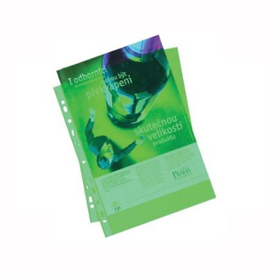 Priehľadné euroobaly z polypropylénu s farebným eurodierovaním. Otvor zhora. Formát A4. Balené v sáčku. Farba okraja zelená. Balenie 100 ks. Hrúbka 90 mic..