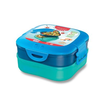 Obdĺžniková sivobiela krabička na obed s modrým vekom. Má vnútorný rozdeľovač, ktorý umožňuje oddelenie dvoch druhov potravín v jednej nádobe. Vonkajší elastický silikónový pásik tmavomodrej farby. Vhodný na ohrev v mikrovlnnej rúre (max. 70 ° C) s otvoreným vekom na uvoľnenie pary. Vhodné na uskladnenie v mrazničke (do -20 ° C). Vhodný na umývanie v umývačke riadu (max. 70 ° C). Viečka a nádoby sa dajú ľahko zložiť k sebe. Matný vonkajší povrch pre lepšie držanie. Vo vnútri so zaoblenými rohmi a lesklým povrchom pre lepšie čistenie. Materiál: plast bez BPA. Rozmery: 20 x 10x 7 cm. Objem: 0,75 litra.