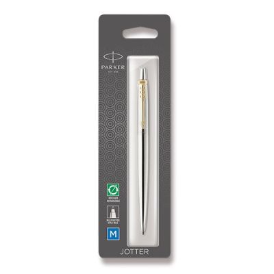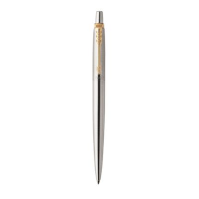 Parker Jotter je dizajnérskou klasikou a dôverne známym modelovým radom, oceňovaným predovšetkýn pre svoju kvalitu, spoľahlivosť a priaznivý pomer ceny a výkonu. Telo a vrchnák z brúsenej nerez ocele. V kombinácii s klipom pokovovaný zlatom, s leštenou úpravou.