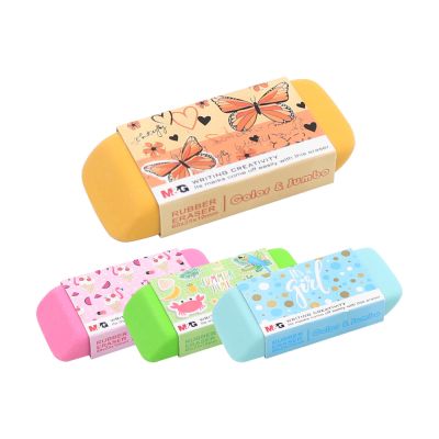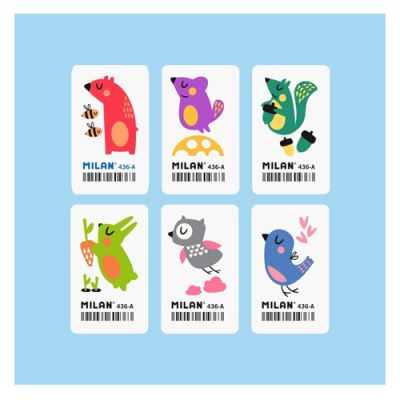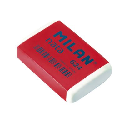 Obdĺžniková guma MILAN 445 z mäkkej syntetickej gumy. Môže byť použitá na gumovanie širokej škály ťahov grafitovej ceruzky zo všetkých druhov papiera. S detským dizajnom v rôznych farbách: biela, ružová, zelená.