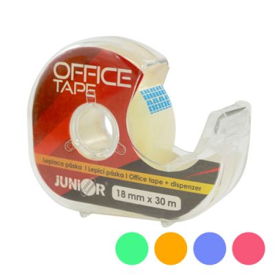 Lepiaca páska s dispenzorom od značky JUNIOR. Predáva sa v piatich farbách, akými sú zelená, oranžová, fialová, ružová a červená. Dĺžka pásky je 30 m a šírka je 18 mm. Vďaka dispenzoru si viete nadávkovať toľko pásky, koľko potrebujete.