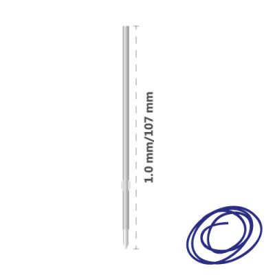 Modrá guľôčková náplň do pera, dĺžka 107 mm, s krídelkami na zachytenie pružinky, priemer guľôčky 1 mm.