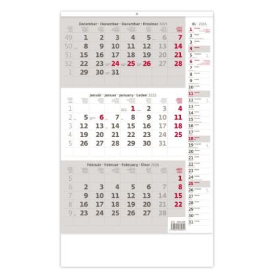 Plánovací 3-mesačný sivý kalendár s priloženou hornou čistou lištou, s menami v SK + CZ, názvy mesiacov a dní v SK, CZ, UK, DE a HU.Formát: 295 x 663 mmRozsah: 12 listovKalendárium: SK/CZ