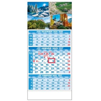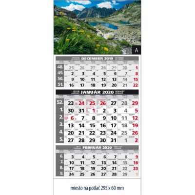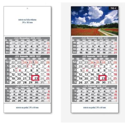 Rozmery: 295 x 663 mm. ROZSAH: 12 listov. KALENDÁRIUM: 3-mesačné s menami SK+CZ názvy mesiacov a dní v SK, CZ, UK, DE, HU. VÄZBA: šitá s perforáciou. REKLAMNÁ POTLAČ: 295 x 60 mm. BALENIE: 50 ks.