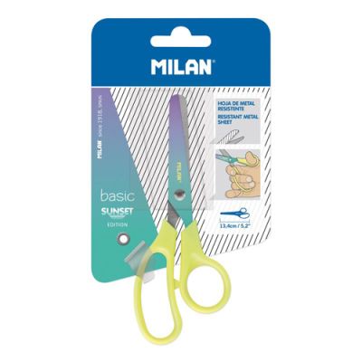 Nožnice MILAN Basic s čepeľou z nehrdzavejúcej ocele so zaoblenou špičkou. Plastová rukoväť. Ideálne pre použitie v škole. Farba zelená. 13,3 cm. Balenie: blister.