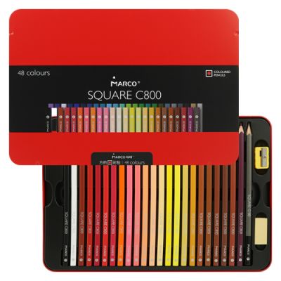 Umelecké pastelky MARCO sú určené pre profesionálov aj amatérov, ktoré presvedčia ich vysokou kvalitou. Štvorhranné farebné pastelky v praktickom plechovom boxe. Sada obsahuje 48 farebných pasteliek (zlatá+strieborná), strúhadlo a gumu. Krásne sýte farby z kvalitného dreva, ktoré zaručuje ľahké strúhanie. Dĺžka pastelky 175 mm, hrúbka ceruzy 6,9 mm, hrúbka tuhy 3 mm/HB. Odolnosť proti lámaniu, maximálna svetlostálosť a optimálne nanášanie farieb.
