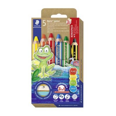 Súprava farebných ceruziek Noris Junior je ideálna pre deti, ktoré sa učia písať a kresliť. -farebné ceruzky v hrubom, ergonomickom tvare pre jednoduché a pohodlné písanie -ergonomický šesťhranný dizajn pre pohodlné držanie -3 v 1: farebná ceruzka, voskovka a akvarelová ceruzka v jednom -ideálna na papier, kartón, sklo a iné tmavé povrchy -hrubý hrot odolný voči lámaniu -mimoriadne mäkký a žiarivý farebný hrot -certifikát PEFC – zaručuje zodpovedné lesné hospodárstvo -udržateľné balenie z minimálne 80 % recyklovaných materiálov -odporúčané od 2 rokov -Obsah súpravy: 5 ks farebných ceruziek -1 ks grafitová ceruzka 2B -1 ks strúhadlo Značka: STAEDTLER Výrobca: STAEDTLER SE Adresa: Moosäckerstr. 3 , 90427 Nuremberg, Germany Web: http://www.staedtler.com Email: https://www.staedtler.com/intl/en/service/contact/