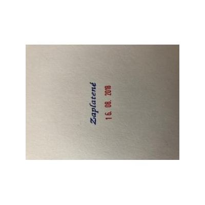 Samofarbiace pečiatky s hotovým textom: ZAPLATENÉ. Veľkosť odtlačku 14 × 38 mm. Farba odtlačku červená. Náhradná poduška E/20 červená.