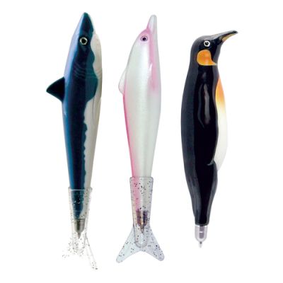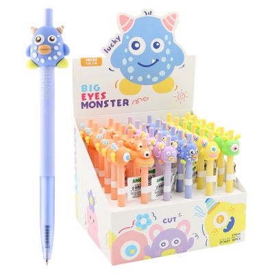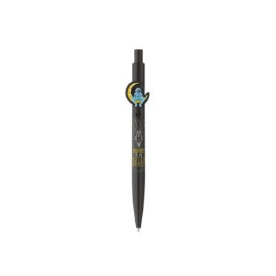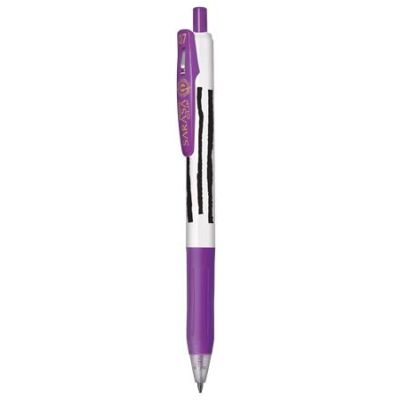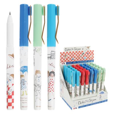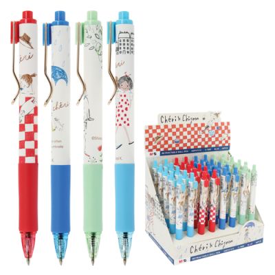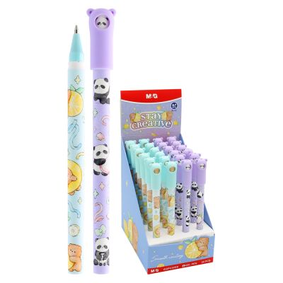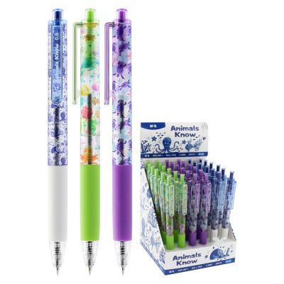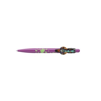 Gélové pero s transparentným plastovým telom, jednofarebným ergonomicky tvarovaným úchopom. Vymeniteľná gélová náplň modrej farby, šírka stopy 0,5 mm. Horná časť dekoračne potlačená detským motívom.