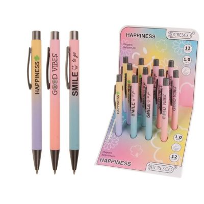 Guľôčkové plastové pero v sviežich moderných farbách s modrou náplňou. Priemer hrotu 0.7 mm, stláčací mechanizmus, farba náplne modrá. V ponuke ako mix 4 farieb. Náhradná náplň: 98102
