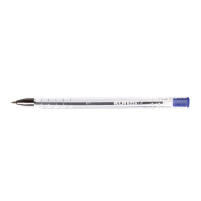 Jednorazové guľôčkové pero s priehľadným telom a viditeľnou farbou atramentu. Guľôčka 1 mm, širka stopy 0,7 mm. Väčšie balenie 20 ks v jednej farbe. Farba: modrá