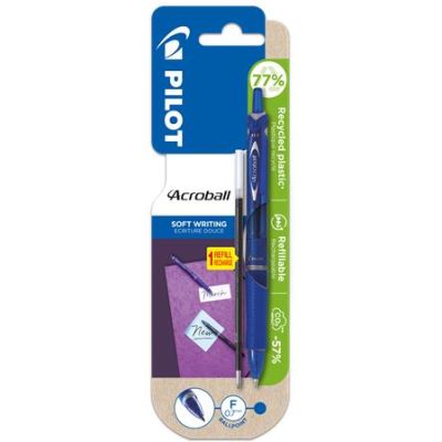 Guľôčkové pero PILOT Acroball s darčekom. - stláčací mechanizmus - pogumovaný úchyt - vďaka priehľadnému telu pera je dobre viditeľné množstvo atramentu. - nový typ olejového atramentu, ktorý umožňuje mimoriadne ľahké písanie - vyrobené zo 78 % z recyklovaných materiálov, okrem vymeniteľných častí - guľôčka zo zliatiny karbidu volfrámu: odolná voči nárazom, vďaka čomu si dlhodobo zachováva guľatý tvar, zabezpečuje presný a plynulý písací prejav a zabraňuje vytekaniu atramentu -priemer guľôčky: 0,7 mm -hrúbka písma: 0,25 mm