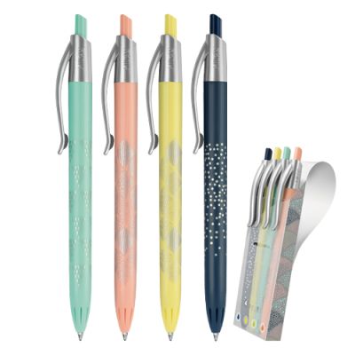 Guľôčkové plastové pero v sviežich moderných farbách s modrou náplňou. Priemer hrotu 0.7 mm, stláčací mechanizmus, farba náplne modrá. V ponuke ako mix 4 farieb. Náhradná náplň: 98102