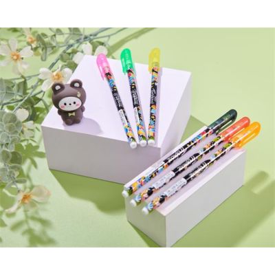 Gélové pero s transparentným plastovým telom, jednofarebným ergonomicky tvarovaným úchopom. Vymeniteľná gélová náplň modrej farby, šírka stopy 0,5 mm. Horná časť dekoračne potlačená detským motívom.
