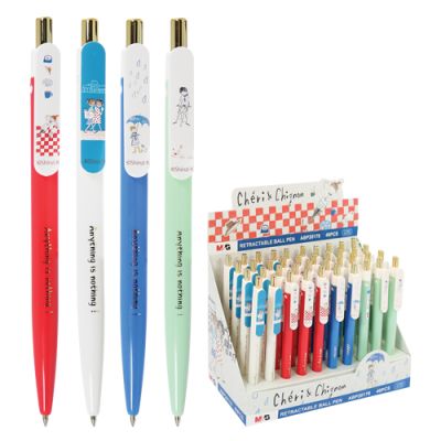 Gulúčkové pero od značky M&G, podkategória LIGHT YEAR AWAY. Pero je v troch farebných dizajnoch s klipom. Náplň pera je modrá. Šírka stopy pera je 0,7 mm.