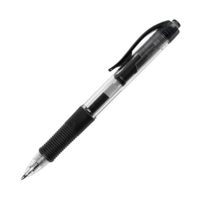 Gélové pero s transparentným telom a vrchnákom vo farbe náplne, priemer guľôčky 0,7 mm, farba čierna.