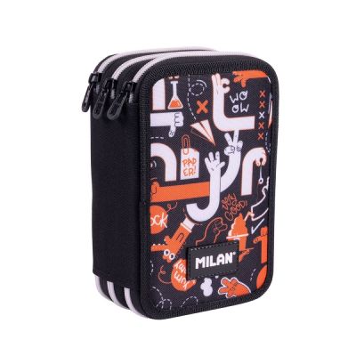 Peračník MILAN - 2 poschodový, naplnený, nová séria Fun Obsah peračníka: 18 fixiek s kónickou špičkou12x trojuholníkové pastelky1x guľôčkové pero CAPSULE (čierne)1x HB grafitová ceruzka1x pravítko 15 cm1x AFILA strúhadlo2x syntetická guma Hmotnosť: 0,48 kg Zloženie látky: polyesterová vonkajšia tkanina a vnútorná podšívka.