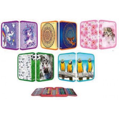 Kvalitné 2-klopé peračníky s príslušenstvom, 32 dielov. Dodávané v mixe motívov. Rozmery 19,5 x 13,5 x 3,2 cm. Balenie 10 ks. Farba mix.
