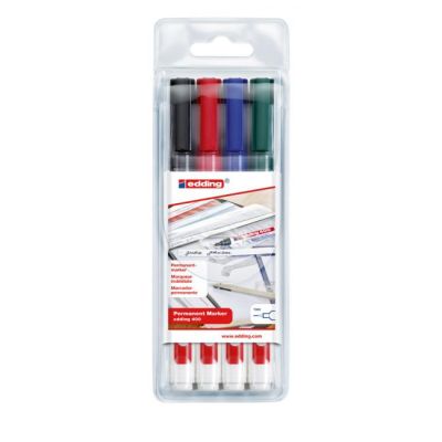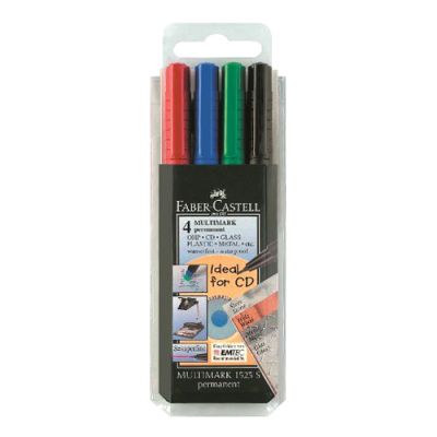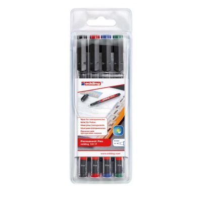 Permanentný popisovač s atramentom na alkoholovej báze a vláknovým hrotom. Vhodný na plastické hmoty, sklo, filmy a pod. Šírka stopy 1 mm. Sada 4 ks.