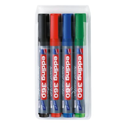 Popisovač s plastovým telom a vymeniteľným hrotom. Dopĺňateľný atramentom edding BT 30. Hrot zrezaný, šírka stopy 2---7 mm. Dodávaný v sade 4 ks.Farba: sada 4 fariebTyp hrotu: zrezanýŠírka stopy: 2 - 7 mm