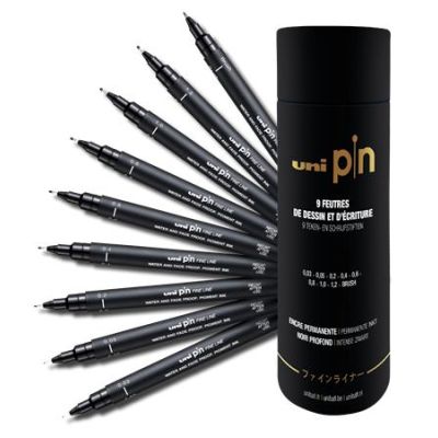 Uni-ball PIN je vynikajúce umelecké pero! Na kreslenie, skicovanie, označovanie, kreslenie štetcom! - obsahuje atrament Super Ink odolný voči vyblednutiu, výtvory zostávajú trvácne - atrament je vodeodolný, takže fixky na kreslenie je možné použiť aj akvarelovými technikami, atrament sa za mokra nerozmazáva - hrot štetcového pera je tvrdý, prispôsobí sa tlak, uhol a rýchlosť písania - všetky hroty vynikajúce na tieňovanie, bodkované tieňovanie a šrafovanie - úplne biologicky rozložiteľné balenie - obsah sady: 0,03 mm, 0,05 mm, 0,2 mm, 0,4 mm, 0,6 mm, 0,8 mm, 1 mm , 1,2 mm čierny popisovač na kreslenie, na 1 čiernom štetcovom pere