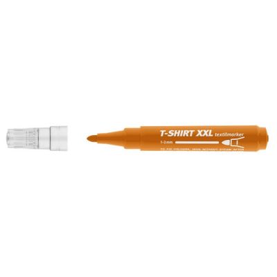 Popisovač na textílie s okrúhlym hrotom strednej hrúbky. Plnený atramentom bez zápachu na báze vody. Farby treba zafixovať žehlením na sucho. Po zafixovaní sú farby odolné voči praniu do 60°C. Šírka stopy: 2-3 mm. Farba: oranžová.
