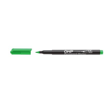 Permanentné popisovače na alkoholovej báze s ergo držaním na popisovanie transparentných fólií do spätných projektorov, ale tiež na plastické hmoty, sklo a pod. Väčšie balenie 10 ks v jednej farbe. Hrot okrúhly, šírka stopy 0,3 - 0,4 mm. Farba zelená.