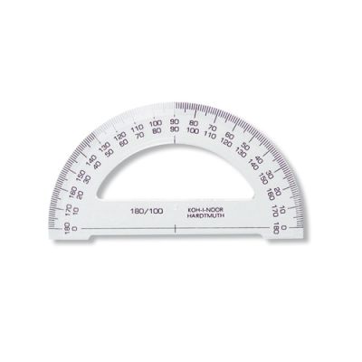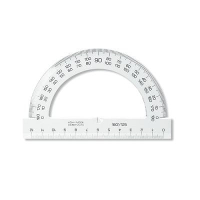Veľký uhlomer 180° so 120 mm pravítkom; vyrobený z transparentného PVC.