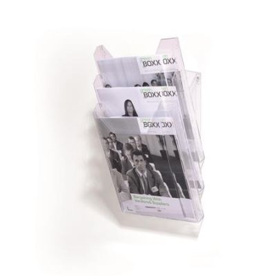 Stolný stojan s tromi odkladačmi unikátneho dizajnu z vysokokvalitného akrylu. Ideálny na brožúry, katalógy a letáky. Hĺbka odkladača 30 mm. 25-ročná záruka na odolnosť voči UV žiareniu. Rozmery 245 × 400 × 170 mm. Farba číra.