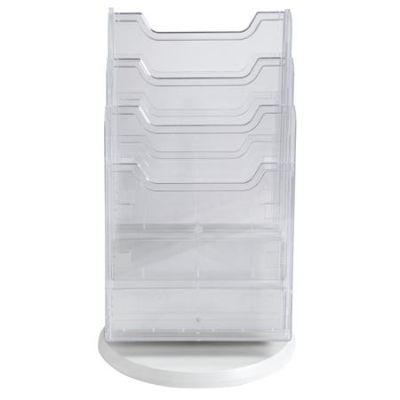 Stolový stojan na prospekty formátu A4 otočný ideálny na informačné materiály pre recepčné pulty, výstavné miestnosti alebo čakárne plastový na dokumenty vo zvislej orientácii A4 priehľadný 6 priehradiek (každá priehradka s hĺbkou 28 mm) rozmery: 315 x 315 x 465 mm (š x v x h)