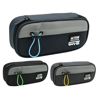 Ľahučké puzdro /peračník s gumenou nášivkou "ACTIVE" a štýlovou gumičkou v neónovej farbe (gumička v modrej, zelenej alebo žltej farbe). Priestor vo vnútri obsahuje: hlboké vrecko pod vrchnou klopou štyri gumičkové pútka na písacie potreby priestranná komora na voľne ložené školské potreby materiál: Polyester, PU Cena je za 1 kus.