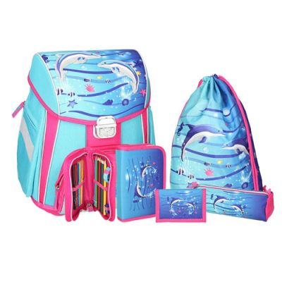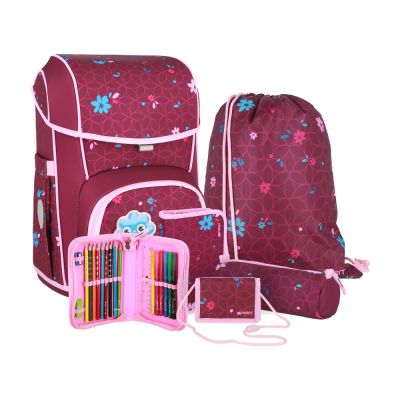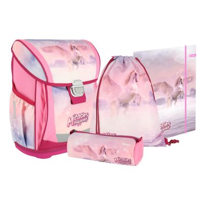 Sada obsahuje: školskú tašku, vrecko na prezúvky, naplnený peračník, okrúhle puzdro, peňaženku a nášivku na suchý zips s dizajnom na ozdobenie tašky.Kvalitná, pevná taška vhodná pre deti na 1. stupni ZŠ. Vlastnosti: priedušný, anatomicky tvarovaný a vystužený chrbát "Spirit Ergo & Air Flow System" nastaviteľné ramenné popruhy v tvare S so silným polstrovaním a s magnetickou poistkou bedrový pás pre väčšiu stabilitu pri nosení tašky profilovaná, stabilná základná doska rozvrh hodín a menovka pod zatváracím vekom tašky rukoväť /uško na ľahké prenášanie alebo na zavesenie tašky novo vyvinutý magnetický zámok reflexné prvky na všetkých stranách tašky pre väčšiu bezpečnosť a viditeľnosť materiál: 100% Polyester hmotnosť: cca 950g objem: 22 L Vnútorný priestor: hlavná komora s priestranným úložným priestorom a priehradkou na priečinky DIN A4 predné vrecko vhodné na obedár alebo peračník 2 bočné vrecká s gumičkou vhodné na fľašu, na desiatu ... Peračník obsahuje: 6 farebných ceruziek 6 fixiek 2 ceruzky HB 1 pravítko 15 cm 1 strúhadlo 1 gumu
