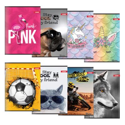 Zošity z bezdrevného papiera, 80-listové, obal polotuhý. Úprava čistá, formát A5. Dodávaný v mixe 2 vzorov bez možnosti výberu konkrétneho vzoru. Väčšie balenie 10 ks.