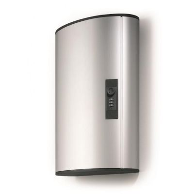 Skrinka na kľúče so zámkom na číselný kód, s dvierkami, otvárajúcimi sa z dôvodu lepšej obsluhy v 180° uhle a vrchným otvorom na odovzdanie kľúča bez nutnosti otvorenia skrinky. Kapacita 54 kľúčov. Jednoduchá montáž na stenu. Súčasťou balenia je montážna sada a 6 menoviek na kľúče v rôznych farbách. Farba strieborná.Výška: 40 cm