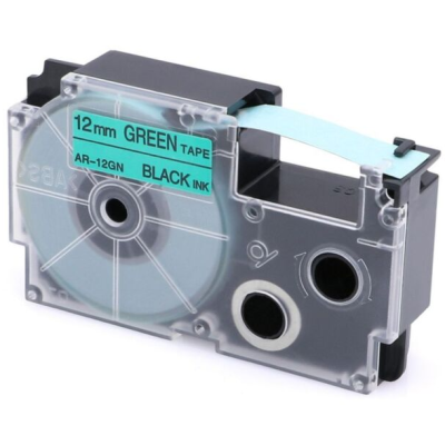 Kompatibilná páska Casio XR-12GN1, 8m, 12mm vo farbe čierna tlač / zelený podklad ponúka spoľahlivý a cenovo výhodný spôsob tlače štítkov pre každodenné použitie.