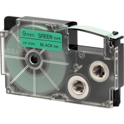 Kompatibilná páska Casio XR-9GN1, 8m, 9mm vo farbe čierna tlač / zelený podklad ponúka spoľahlivý a cenovo výhodný spôsob tlače štítkov pre každodenné použitie.