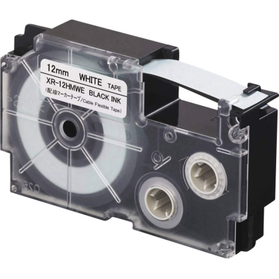 Prémiová páska Casio XR-12HMWE, 8m, 12mm, flexible vo farbe čierna tlač / biely podklad poskytuje vynikajúcu kvalitu tlače, zvýšenú odolnosť a profesionálny vzhľad pre náročné aplikácie.