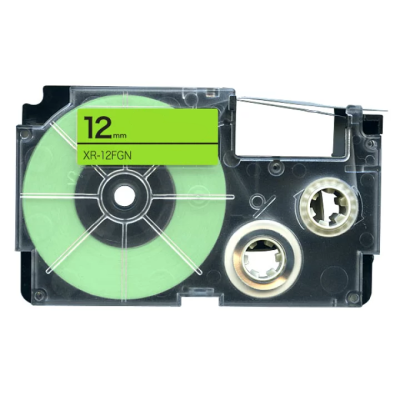 Kompatibilná páska Casio XR-12FGN, 8m, 12mm, fluorescent vo farbe čierna tlač / zelený podklad ponúka spoľahlivý a cenovo výhodný spôsob tlače štítkov pre každodenné použitie.