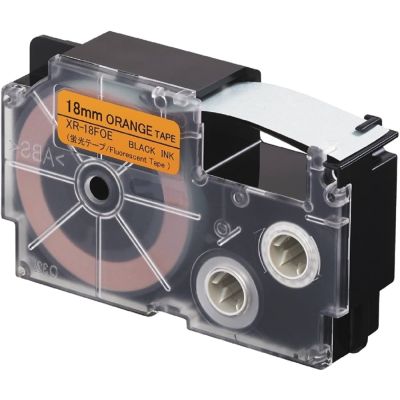Prémiová páska Casio XR-18FOE, 8m, 18mm, fluorescent vo farbe čierna tlač / oranžový podklad poskytuje vynikajúcu kvalitu tlače, zvýšenú odolnosť a profesionálny vzhľad pre náročné aplikácie.