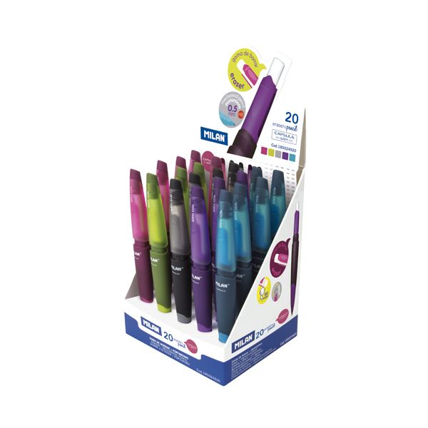 Mechanická ceruzka s pogumovaným povrchom. Priemer tuhy 0,5 mm / HB. Atraktívny dizajn Capsule Slim. Súčasťou pentelky je aj guma, ktorá je umiestnená vo vrchnej časti. K dispozícii v 5 odtieňoch.