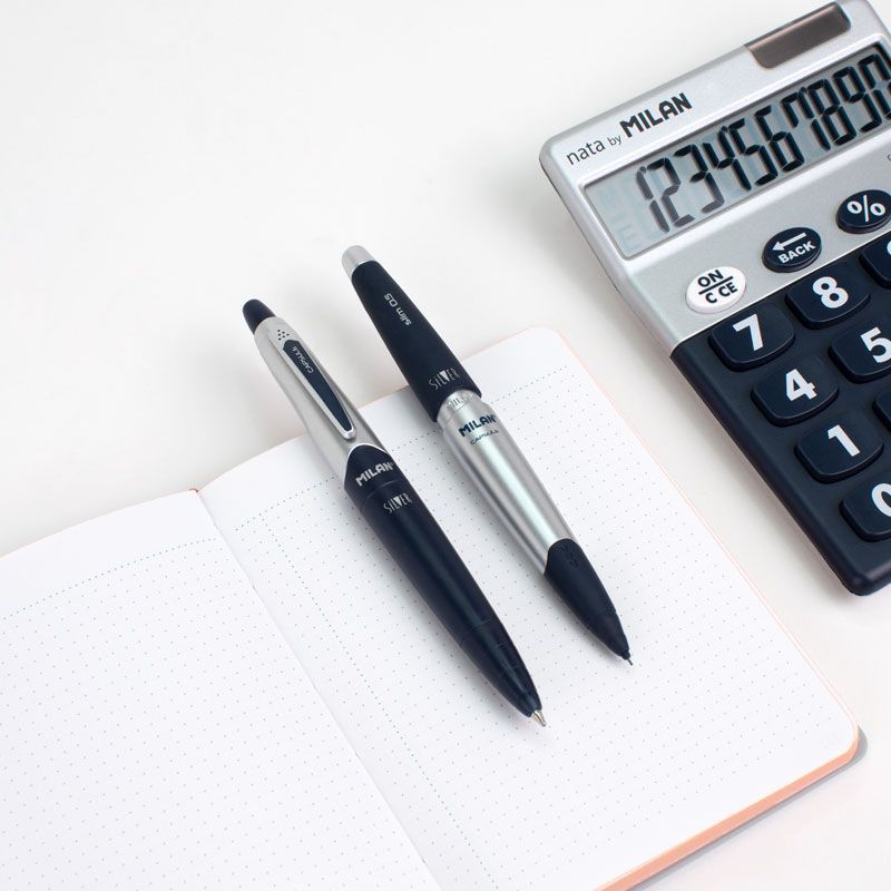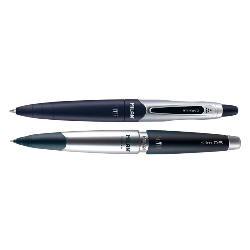 Sada MILAN Capsule Silver obsahuje guľôčkové pero 1.0 mm modré + mechanická ceruzka.