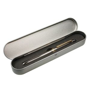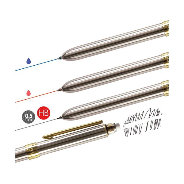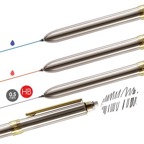 Pero so 4 vlastnosťami: modré pero 0,7 mm, červené pero 0,7 mm, mechanická ceruzka 0,5 mm HB a guma MILAN. Chrómovo strieborná hlaveň, detail centrálneho krúžku s vyrazeným logom MILAN a sponou v zlatej farbe. Kovová krabička: ideálna ako darček. Rozmery pera: 130 x 115 mm.