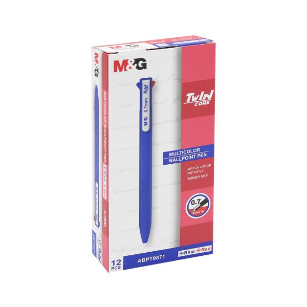 Gulôčkové pero od značky M&G, podkategória TWIN CORE. Pôsobí klasickým dizajnom pera s klipom. Má pogumovaný úchop pre pohodlnejšie písanie. Je to dvojfarebné pero. Náplň obsahuje červenú a modrú.