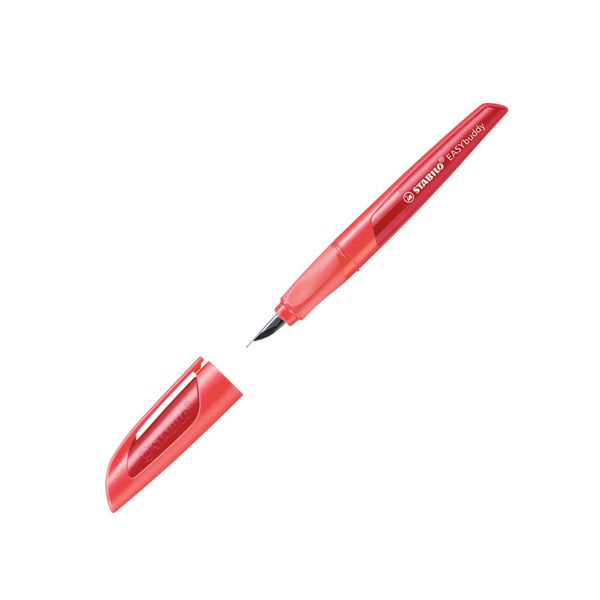 Ergonomické univerzálne plniace pero EASYbuddy coral/red M - pre ľavákov a pravákov, kvalitný hrot s irídiovou špičkou, opätovne naplniteľný štandardnými bombičkami, okienko pre kontrolu hladiny atramentu.