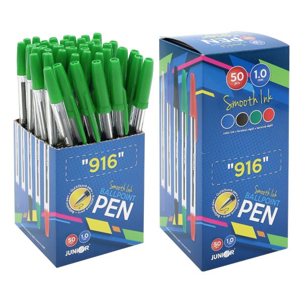 Jednorazové guličkové pero s transparentným čírym telom, so zakončením a uzáverom vo farbe náplne. Zelená farba a priemer 1,0 mm.
